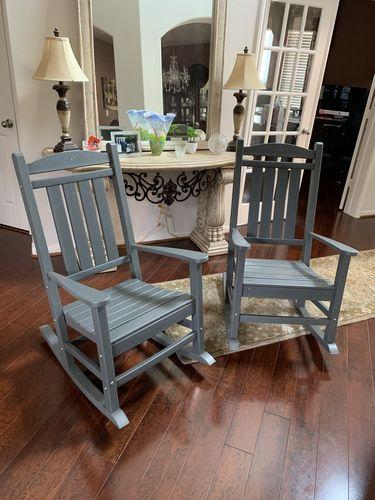 I purchased 2 rockers and a table in navy blue. I am truly enjoying the set. My neighbors have walked by and joined me for a visit. My grandsons like to sit in them and eat popsicles and I’ve rocked my 3 month old granddaughter to sleep. Everyone who sits in them comments on how comfortable they are. Great purchase!