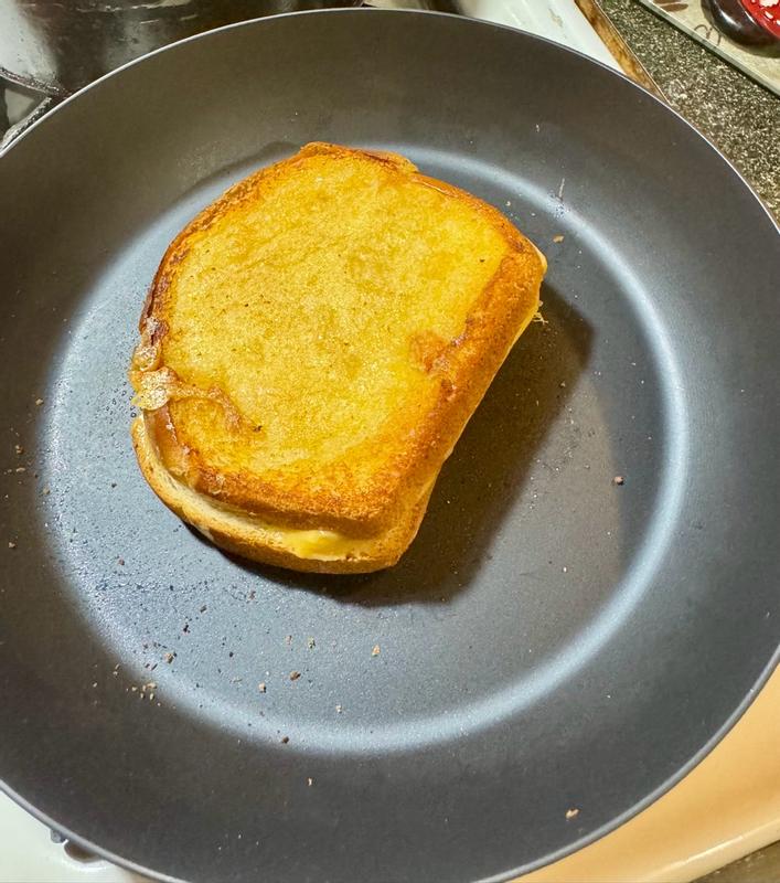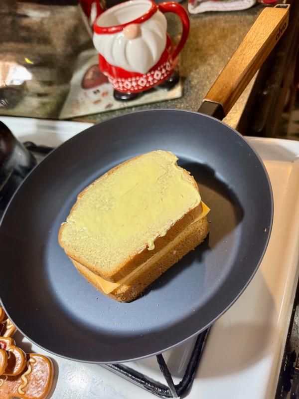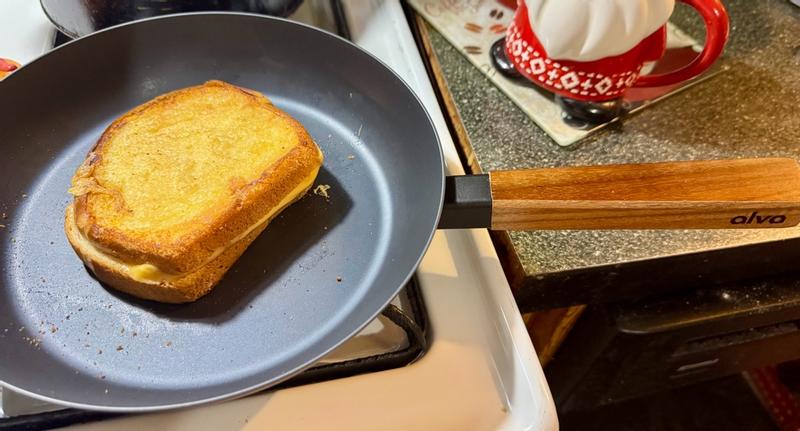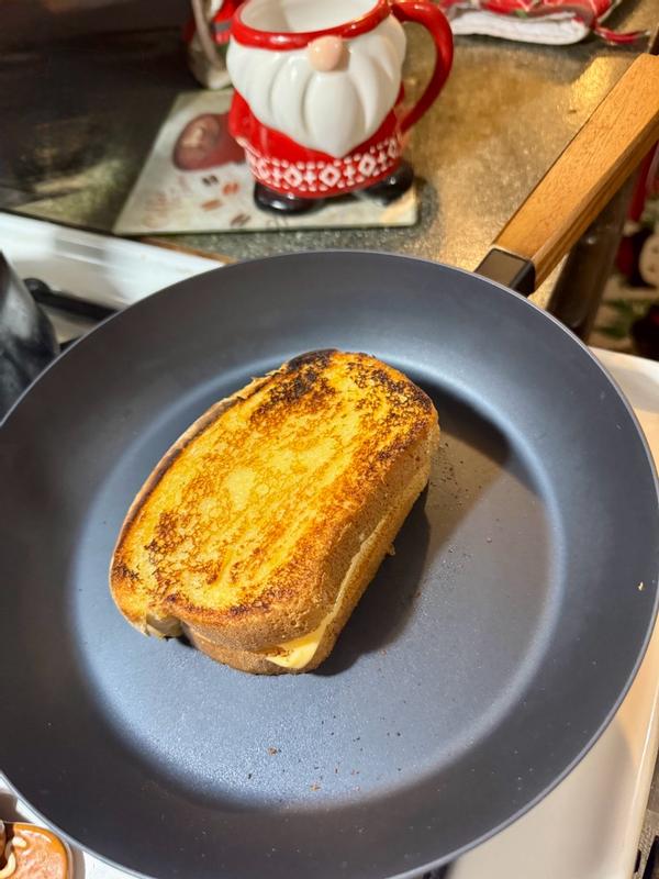 This skillet is a bit of a mixed bag in the most charming way. It’s wonderfully lightweight, surprisingly non-stick, and the wood handle feels so comfortable in the hand — like it was actually designed by someone who cooks. But here’s the catch: this pan is temperamental. You basically have to treat it like a delicate little diva on the stove. If the heat isn’t set to very low, it will scorch your food in seconds. Even on just medium low heat, my grilled cheese got a little more toasty than I prefer. The flip side to that, though, is the heat distribution was even, so at least it burned evenly. Once you adjust to its overly sensitive personality, it can turn out some great results — but there’s definitely a learning curve. Perfect if you want something light and stylish… just be ready to cook low and slow.