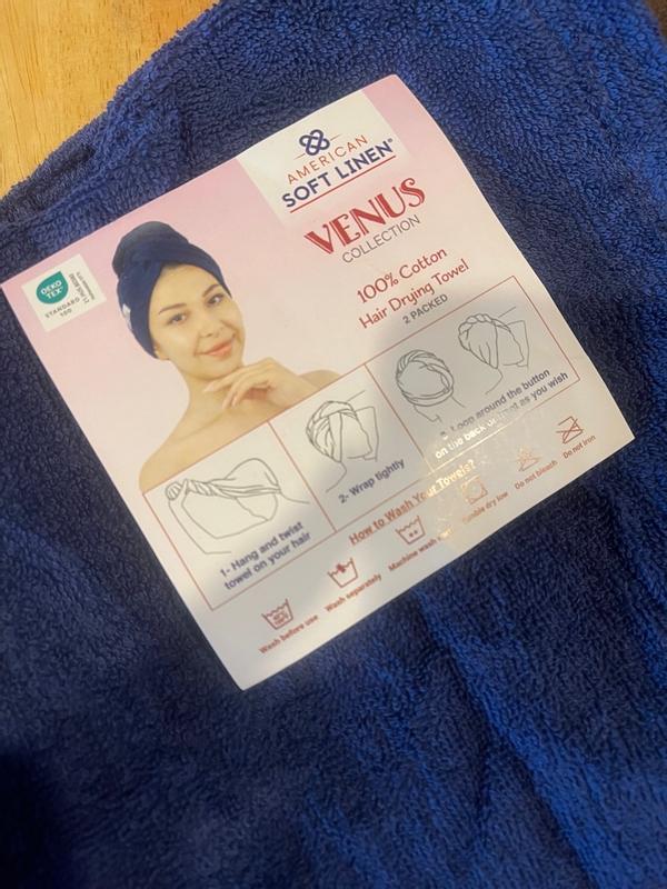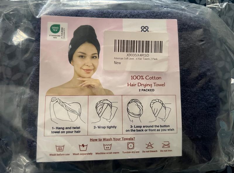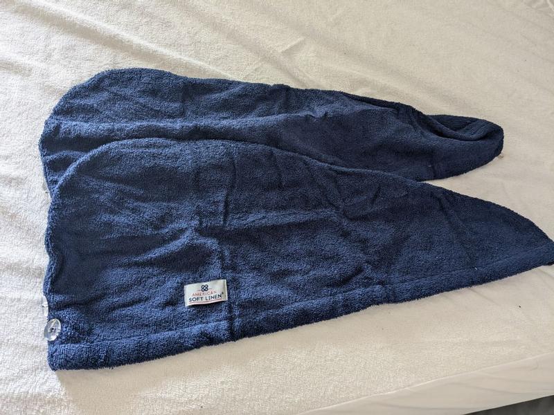 Good material, 100% cotton, easy to use! The button is very helpful, drained the water out of my hair quickly, i really recommend it