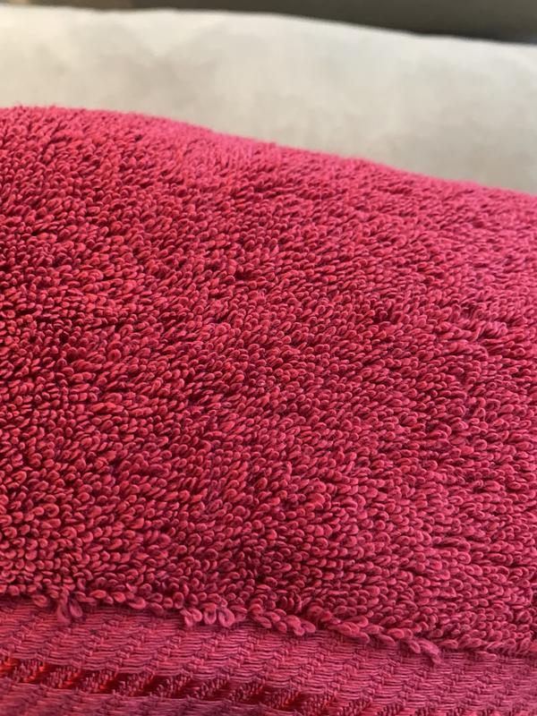 At 50% off, I was happy to get some pretty, all cotton terry towels to match my bathroom. The color in the picture was accurate and they match perfectly. I washed them before usiing, and the color didn't fade or run. The 3 stripes give them a little interest, even though they are solid Am happy so far.
