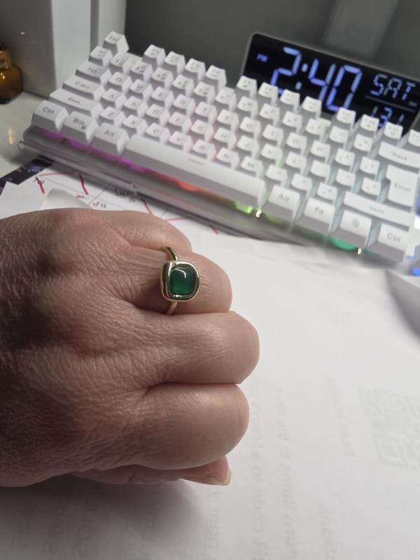 The search for the perfect pop of color ends with this statement ring. Plated in 14k gold, this timeless ring features a round square-shaped design with a deep green onyx stone in the center.