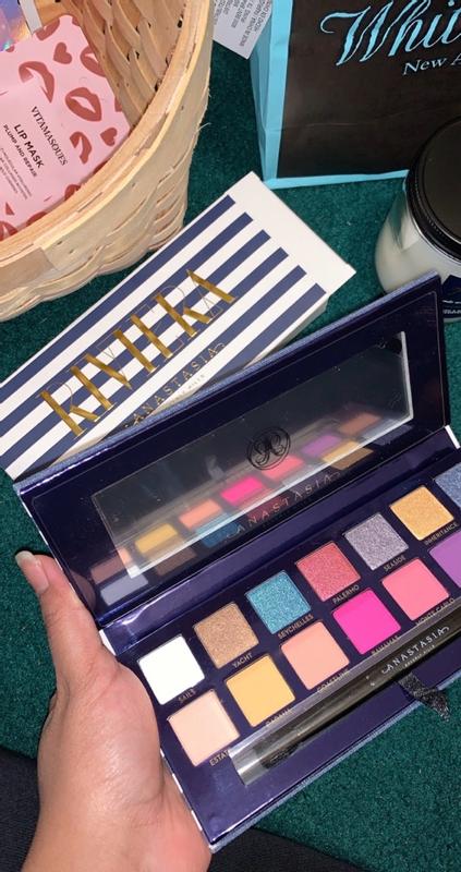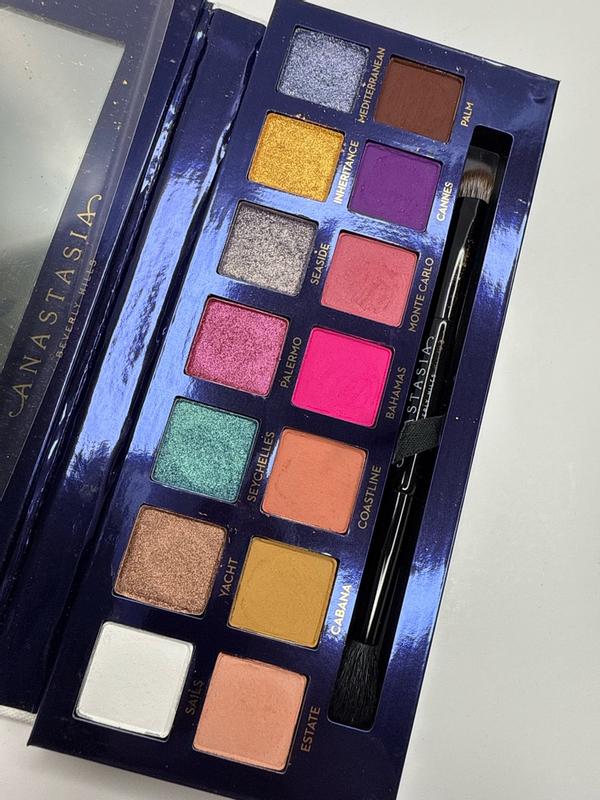 The palette includes 14 shades: a mix of mattes, metallics, and duo-chromes.  • The tones lean summery / vacation-inspired. • The Riviera palette comes in a canvas-textured case with blue and white stripes, evoking seaside / nautical vibes. Many reviewers appreciated that “beach bag” aesthetic.  • Inside, there’s a large mirror and a dual-ended brush (flat side for packing on shadow, fluffy side for blending) — a nice touch for travel / on-the-go use.  • The interior layout is clean and intuitive. Shade names are printed, and the palette feels sturdy for day-to-day handling.