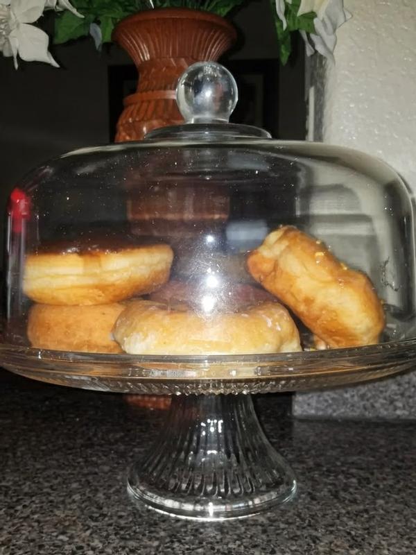 I was really excited to receive this glass cake stand because the design is beautiful and the base is very sturdy. However, the lid unfortunately arrived with a noticeable defect. The glass knob on top has an internal crack/bubble where the handle meets the lid, and it looks like a manufacturing flaw. You can clearly see the irregularity inside the glass, and it makes the lid look damaged even though the outer surface is smooth. For a product that is meant to be displayed, this defect is very disappointing. The stand itself is lovely, but the lid does not meet the expected quality. I would appreciate a replacement lid or a full replacement of the set.