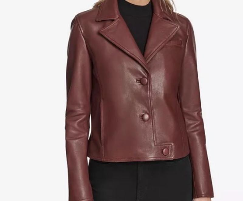 Absolute gorgeous, high-quality leather jacket! I'm 5'6", 34 DDD, and normally wear a M shirt. I chose a size L so I could wear bulkier shirts underneath it. The ruby color is a beautiful brownish red. The leather is soft and not stiff. The button holes are a little tight while buttoning it. Overall, I love this jacket and would highly recommend it.