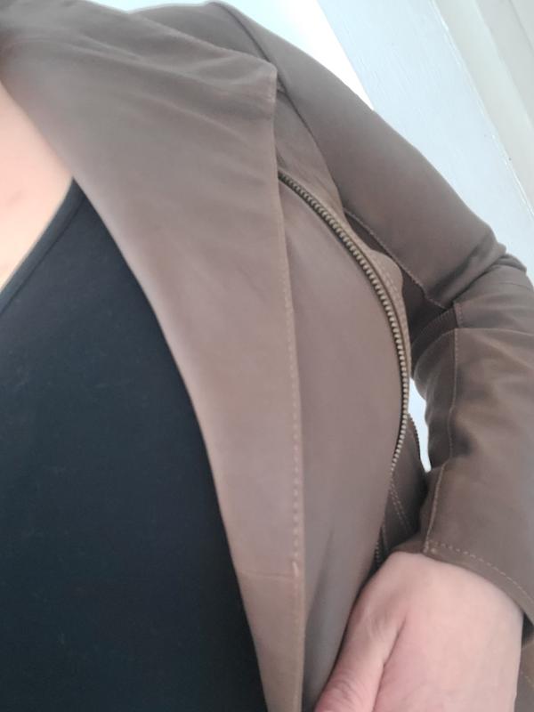 Beautiful jacket, super soft and love the stretchy fabric under the arms! the arms are too long so I’ll need to get them hemmed