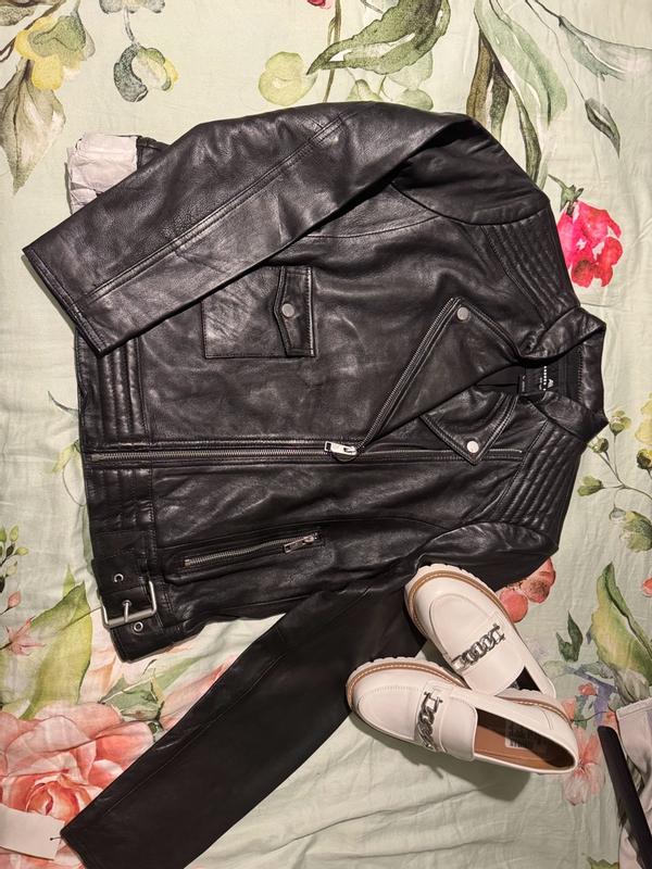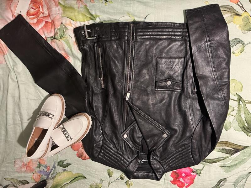 The Frankie moto leather jacket from Andrew Marc features a stand collar and trapunto stitching details. This style is designed with body zipper pockets, a coin pocket, and a waist buckle detail.