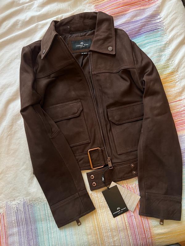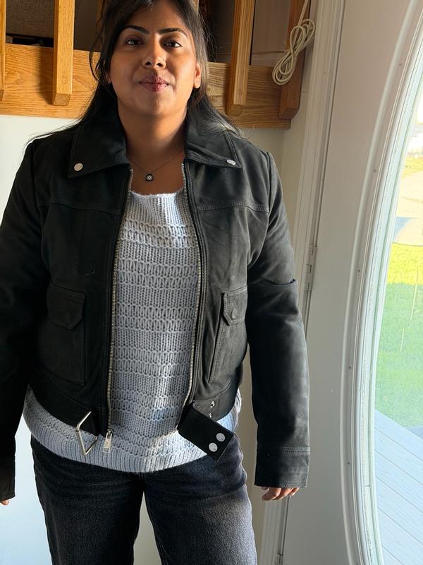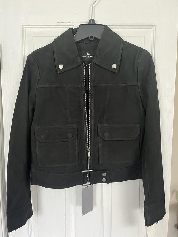 Such a beautiful jacket! It’s a nice suede jacket with some metal hardware! Love this style! My only issue is that I think that it can stain easily and show dirt and lint quickly. It likely needs extra attention for washing and care. Otherwise a fantastic jacket for the fall.