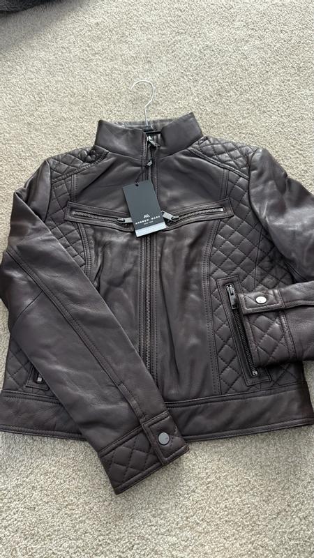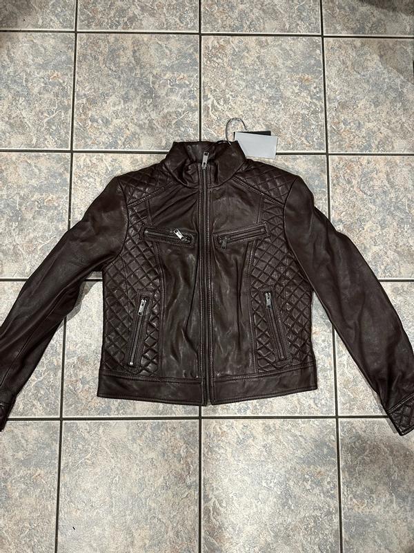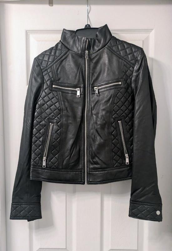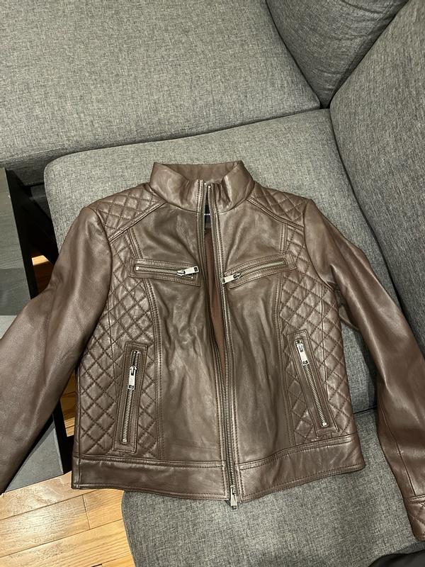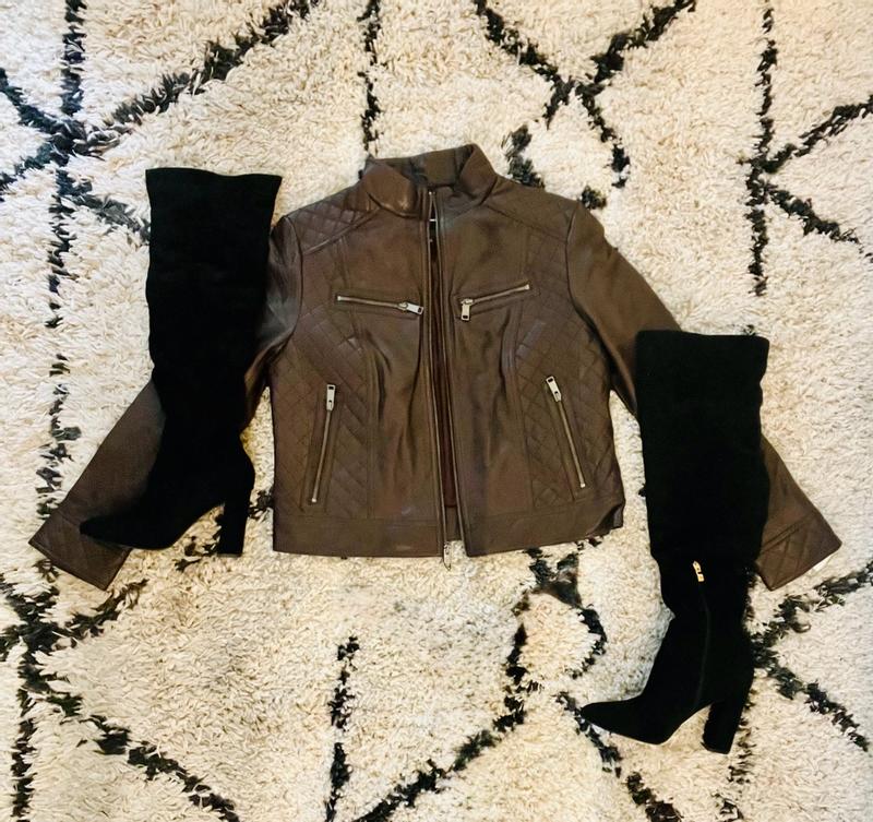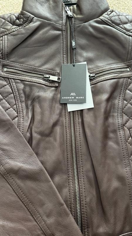 This is a beautiful leather jacket from Andrew Marc. I wasn't familiar with this designer but now I am looking into his use of soft lux leather jackets and other well made outerwear. The jacket features amazing detailed stitching and shiny metal hardware that feels heavy duty that will last for years. The sizing was perfect being a form fitting jacket. I took a small being 5'6" and 130lbs. I've worn this with jeans, dress pants and over a dress and the style is chic and edgy.