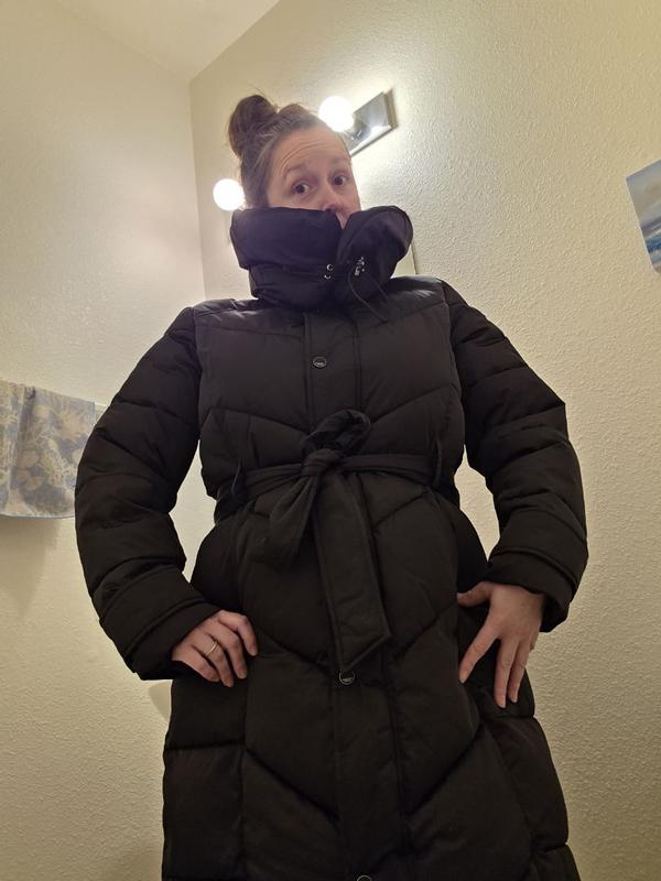 I love this parka, it’s so cute and stylish. The belt is a nice touch. I love that it’s long too and hits right below the knee. It seems to do OK in extreme cold too if you layer up underneath.