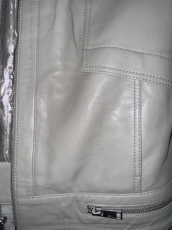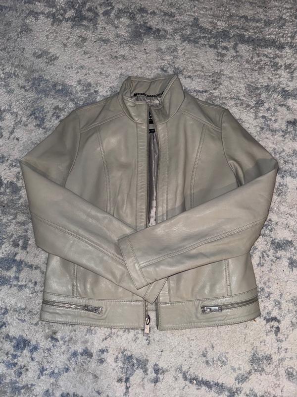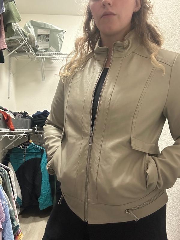 I was expecting a white/ cream color as shown on the model and in reviewer’s photos. The color of the jacket I received in August 2025 is more of a light taupe with a hint of olive. As others have mentioned, for those who are in between sizes, size up. I am 5’1” 36” chest, 128 lbs; the medium is right for me. The jacket can be worn over a medium weight sweater. Though the texture of the leather is soft, it is a bit stiff, which I expect would become more pliable with wear. On me, the stiff collar hits along my jawline which is a bit uncomfortable.
