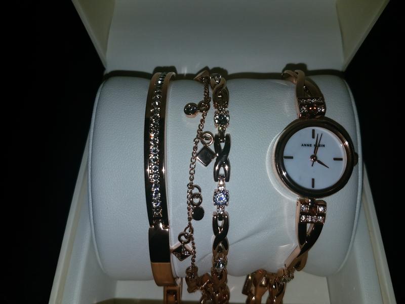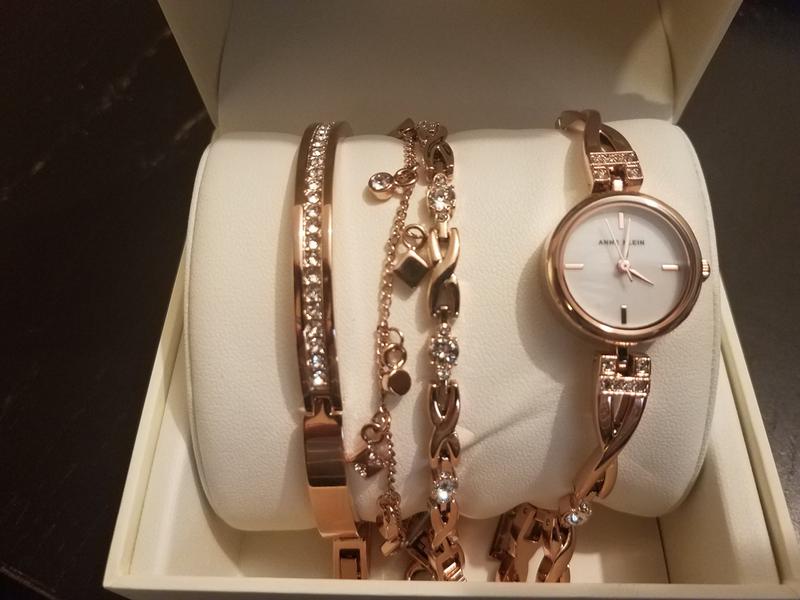 Pictures of this set don't do it justice. The rose gold color is so pretty in person. I love the bracelets and wear at least one every day, they aren't showing any signs of wear to the color like a lot of pieces do. The watch itself is an elegant contribution to any occasion. The fit is standard, and easy to adjust. This is my first Anne Klein product, but won't be my last.