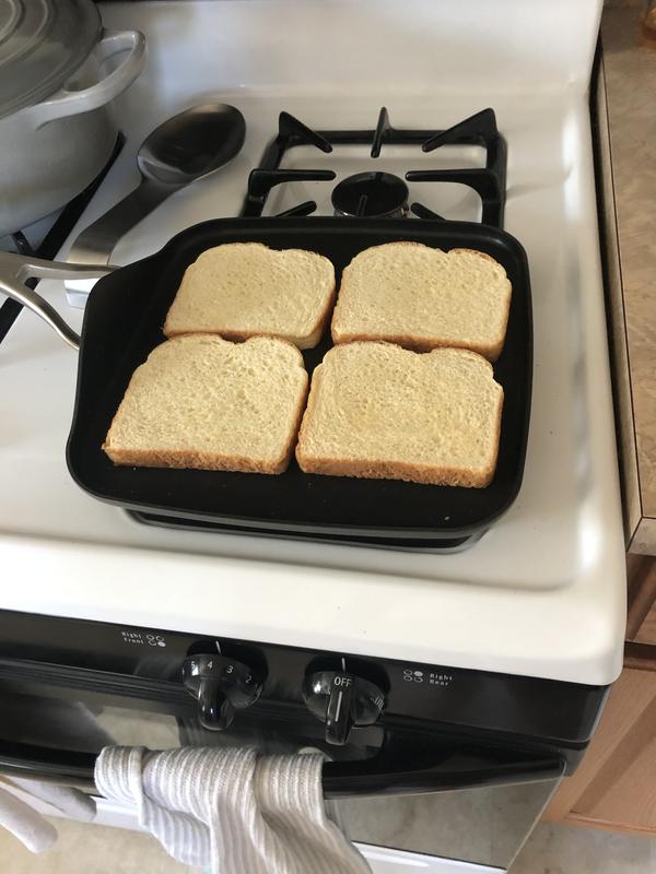 Absolutely love this griddle pan! It’s large enough to fit four pancakes on, or four pieces of toast. Heats quickly and evenly, it’s slightly large on my burner so I make sure to pre-heat it and cook on a medium temp to help heat the whole pan thoroughly. The non-stick surface cooks very well, and I haven’t used any extra oil or non-stick spray while cooking. Definitely recommend.