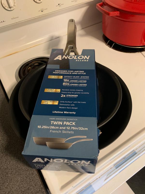 For a double play of high-quality performance, durable construction, and the everyday convenience of Infinity Slide nonstick, reach for the Anolon® Allure Hard-Anodized Nonstick Skillet Set.