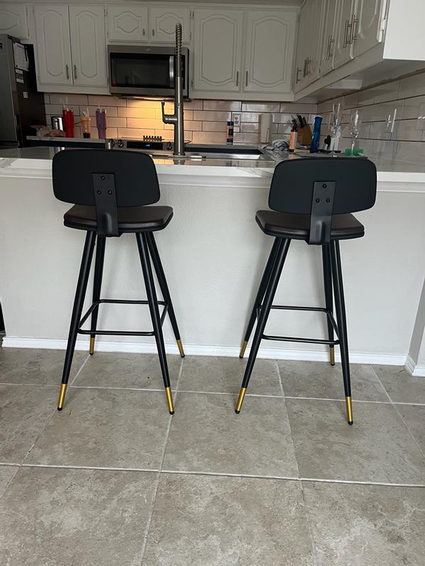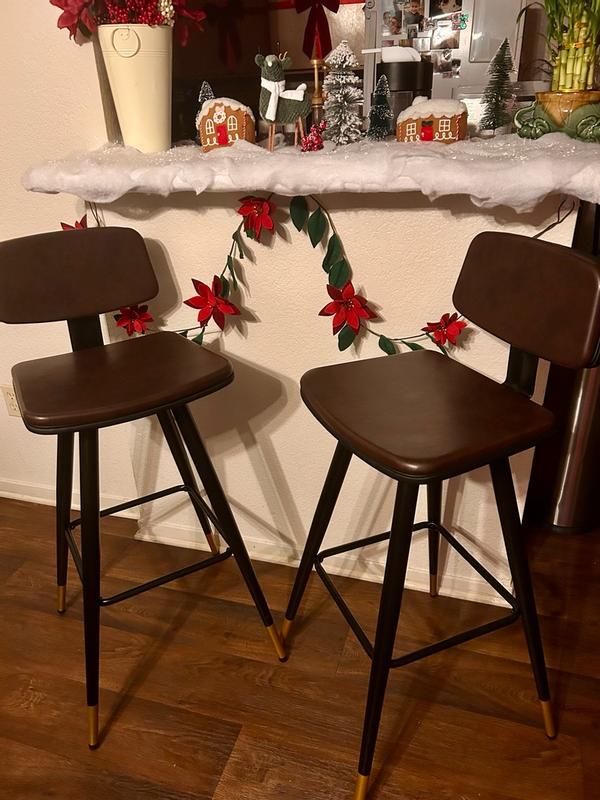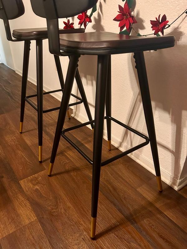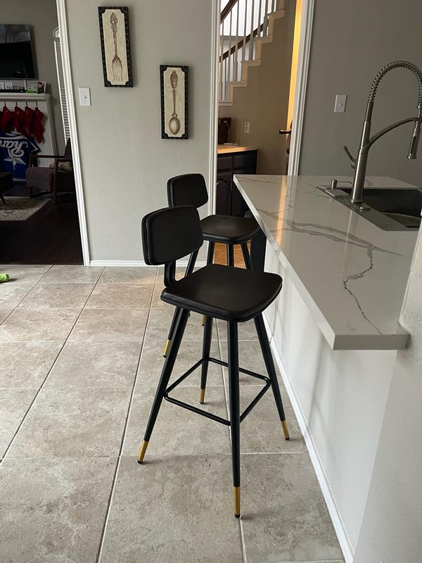 I love the addition of these perfectly crafted barstools in my home. They’re very sturdy, durable, the back is at the perfect height as well as the height of the stool. The design is really nice with the flared gold tipped legs, and the low back makes it a comfortable choice. The leather feels soft and of high quality, and cozy to sit on without any discomfort. Very modern, amazing quality, and superb comfort.