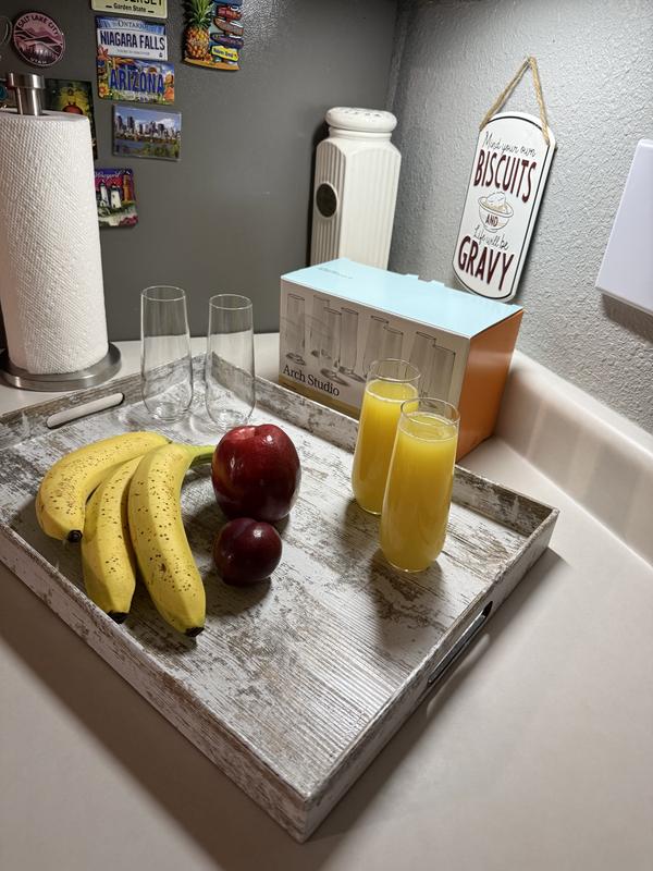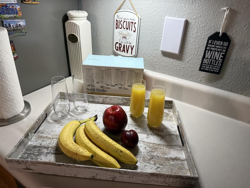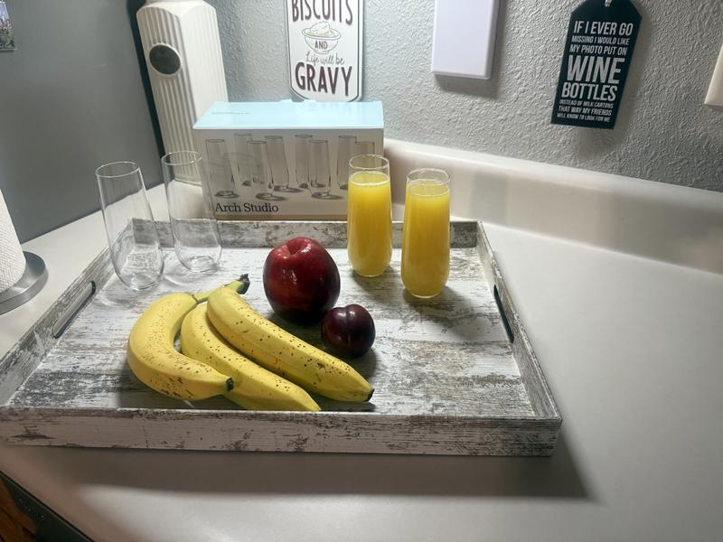 Thank you Macy's! We bought 2 sets of Archway Studio Bistro Glasses on Cyber Monday sale and they were a steal! They are thick and sturdy with a fluted bottom half and wider top half. One set has 4 highball = reg. drink size and 4 old fashioned = juice or kid size. The old fashioned size stacks well in my opinion.