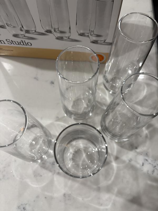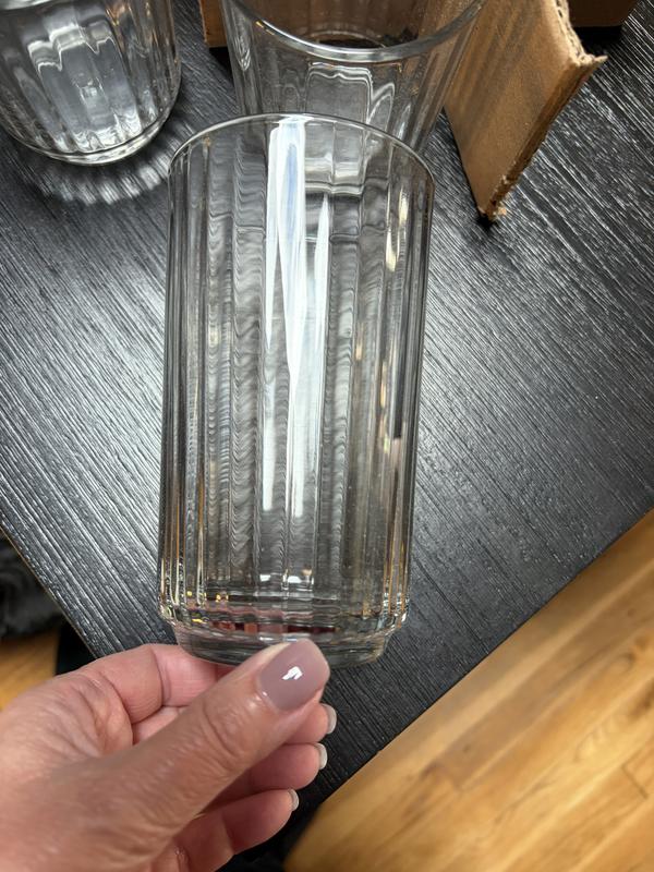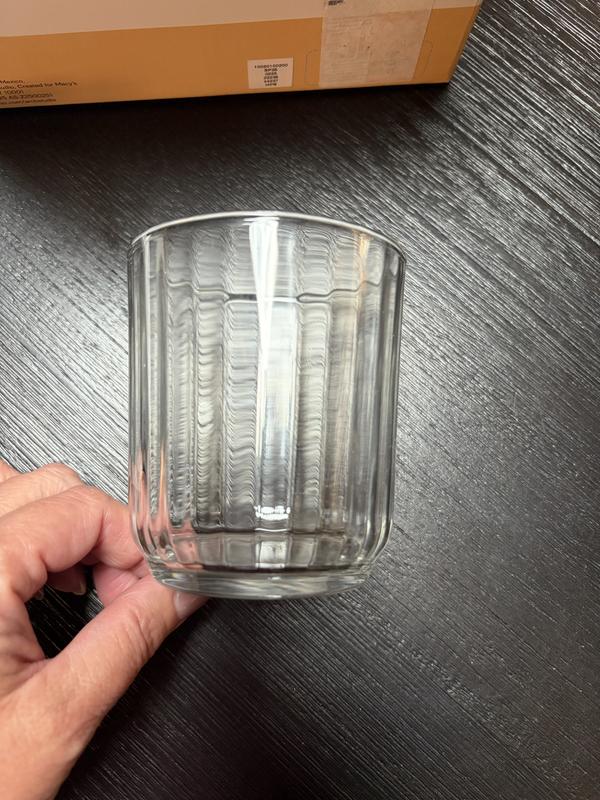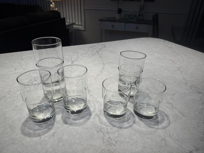 These may not be the prettiest of glasses, but they are very practical. The way they stack saves so much space. I do like that they are not too heavy and yet don't feel delicate. I would have liked them better with a little texture or design. I also like that you get 2 sizes in the set and you can stack any of them together. There is a bump in the rim of 6 out of 8 of the glasses. It doesn't bother me at all, but I am sure it won't sit right with some people.