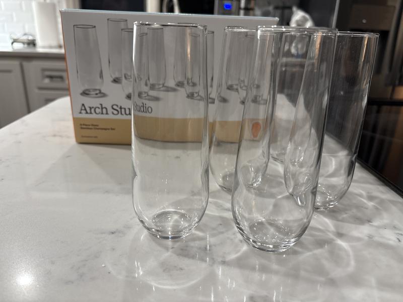 8-piece glass stemless champagne set is a great addition to my kitchen for special occasions. Glasses are sturdy and thick glass - adding elegance to a nicely set table. Looking forward to adding them to my Christmas morning brunch.