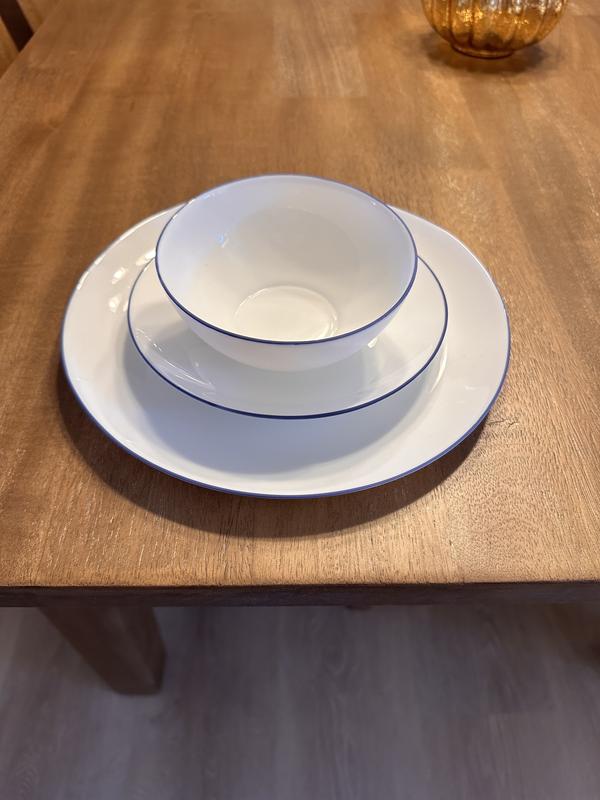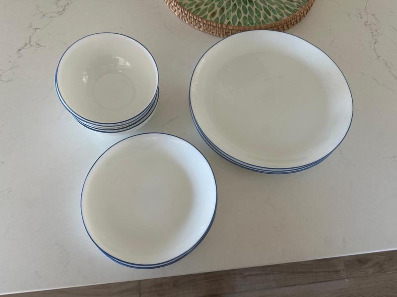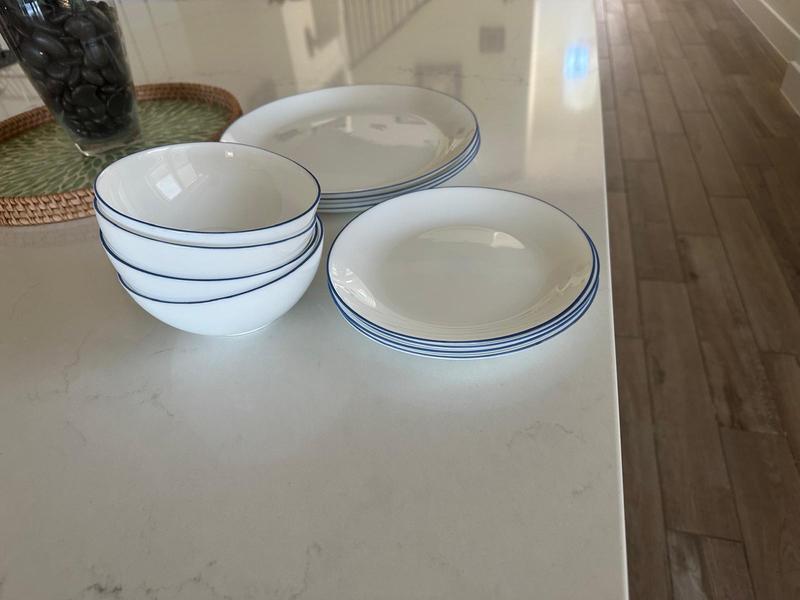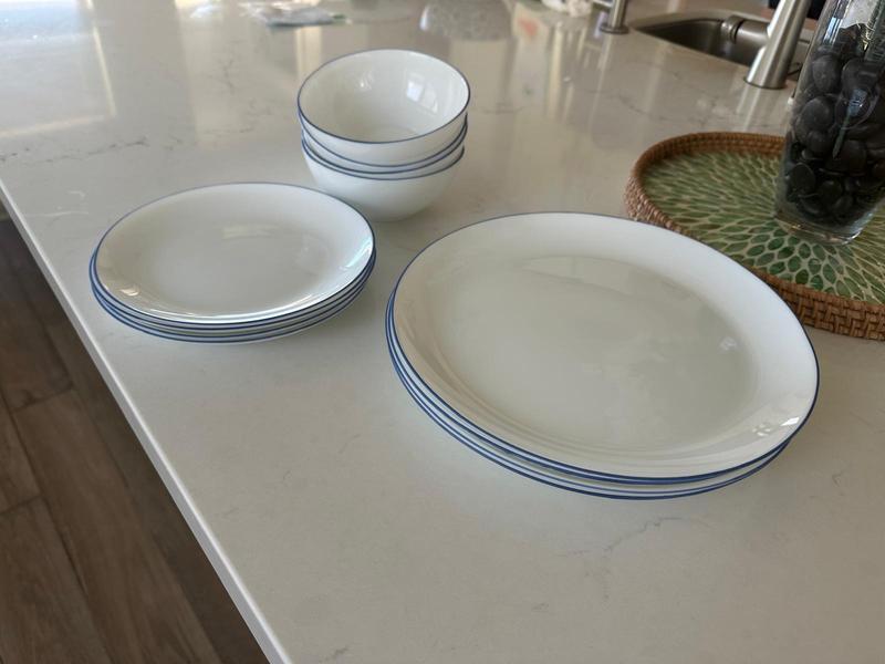 This 12pc dinner set is a nice starter set for someone just starting out with their first place. They came packed very well and none of my pieces were broken. It’s light weight and a little on the thin side but this is a very nice dish set. I love the blue lining around the tops of the plates and the bowls it gives it a nice pop of color with the white.