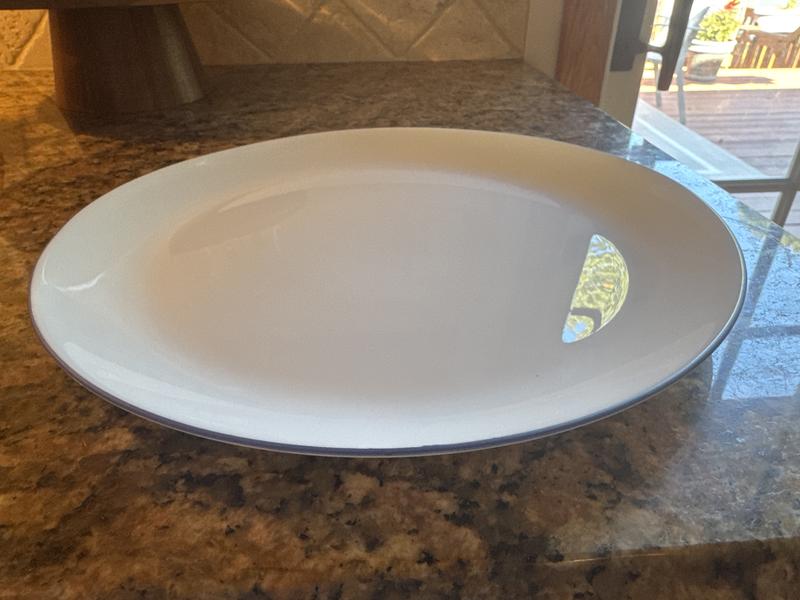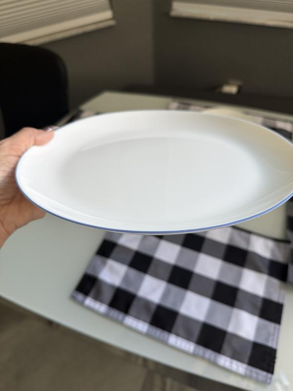 These white, large dinner plates are very nice. They would grace any table with a touch of elegance. The rims are trimmed in a nice shade of blue I did find that these plates are slightly heavy but overall, they are good.