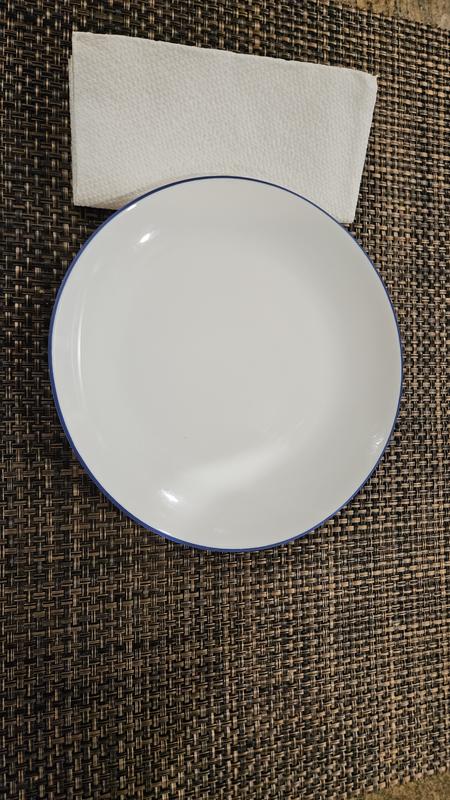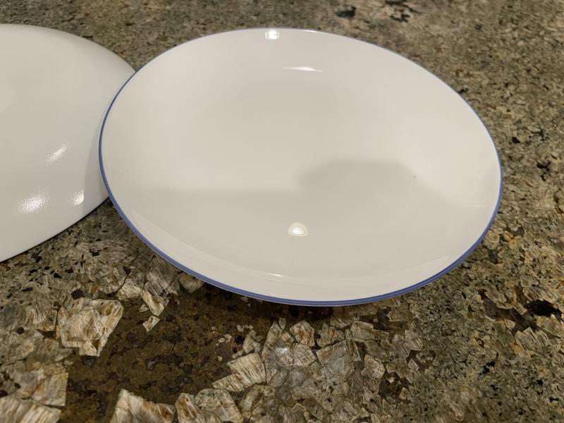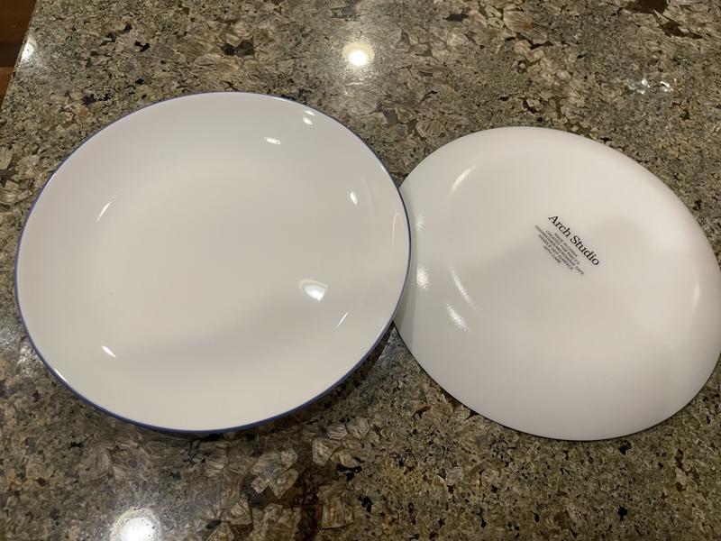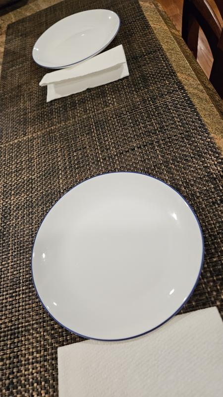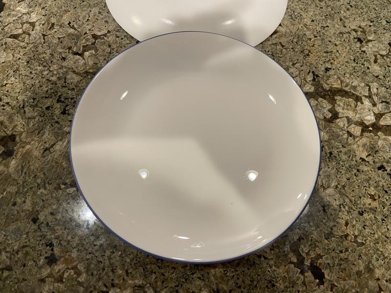 I was looking for small plates to use for a small meal or salad. These plates are the perfect size. It's lightweight and seems very durable. They are very simple and the blue edge gives the perfect hint of color. Love them!!!