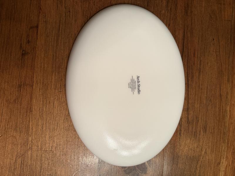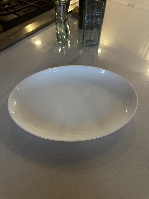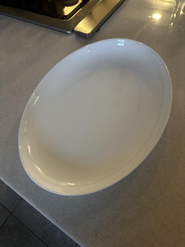 Perfect white oval platter. It is lightweight glass. It is a medium size so it does not take up too much room in the cabinets. The white color goes with other dinnerware.