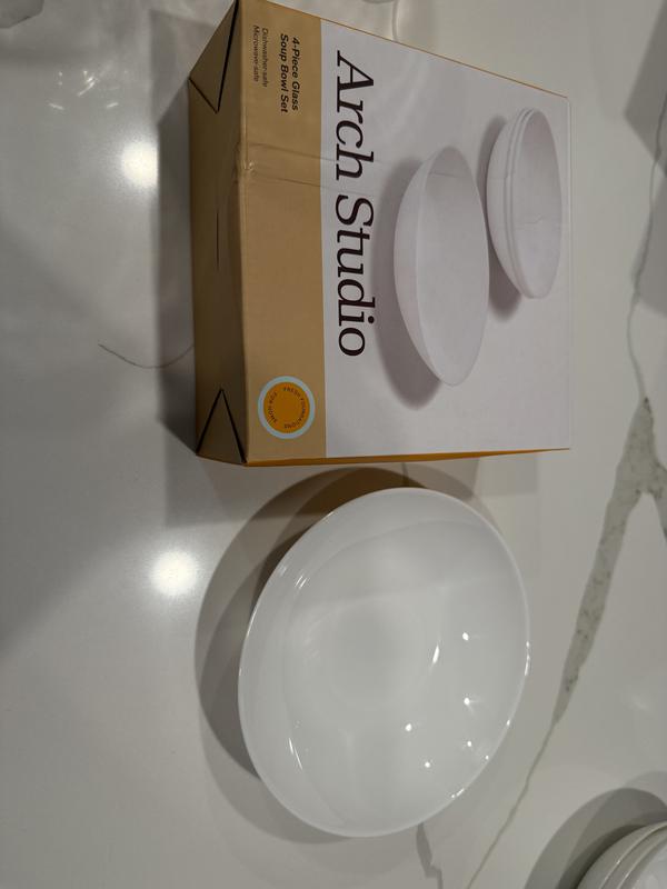 Absolutely love the Arch Studio Opal Dinner Bowl Set. These bowls are white, thin and lightweight. Easy to use, kept my soup hot and easy to clean. The outside of the bowls are textured which is a great for additional gripping support. We loved them so much I just purchased the 12 piece Dinnerware Set!!
