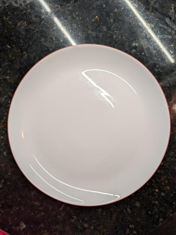 Good for an every day use plate. Appropriate size to fit your typical meal portions of protein & 2 sides. It has a sleek almost shiny finish that in my opinion helps easily clean up, even if you only have time for a quick rinse. However, that same finish made it feel a little slick in my hands when handling. The dish is light but feels sturdy. It's really hard to see the decorative red detail outline.