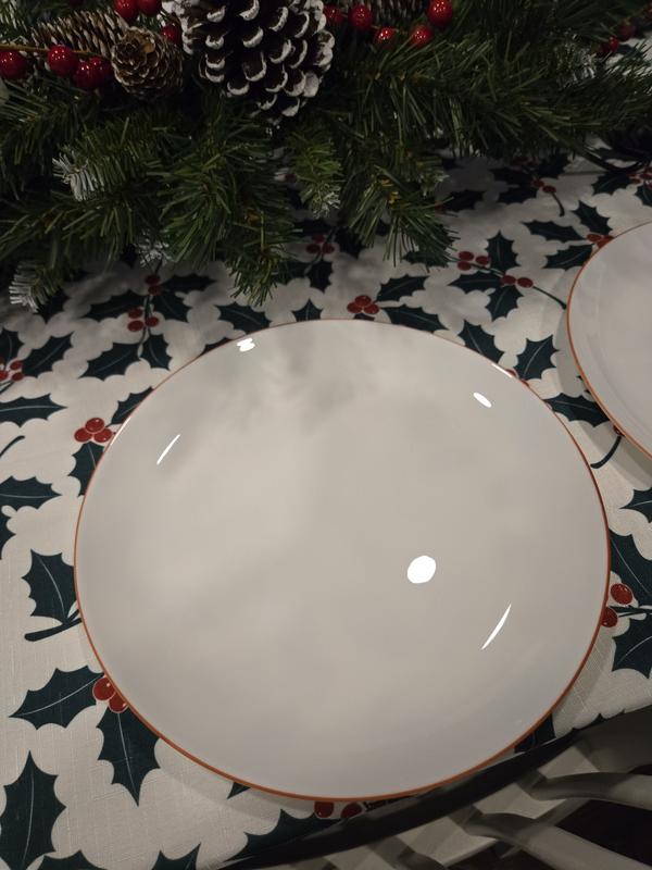 This gorgeous off-white 4-piece Arch Studio dinner plate set features a burnish orange and subtle red trim, and I have to say, it’s been a fantastic addition to my kitchen. The design is stylish enough to impress guests, but still subtle enough for everyday use and lightweight. Plus, they’re dishwasher and microwave safe, which is a huge bonus for easy cleanup and reheating. Overall, I’m really pleased with these plates and would definitely recommend them!