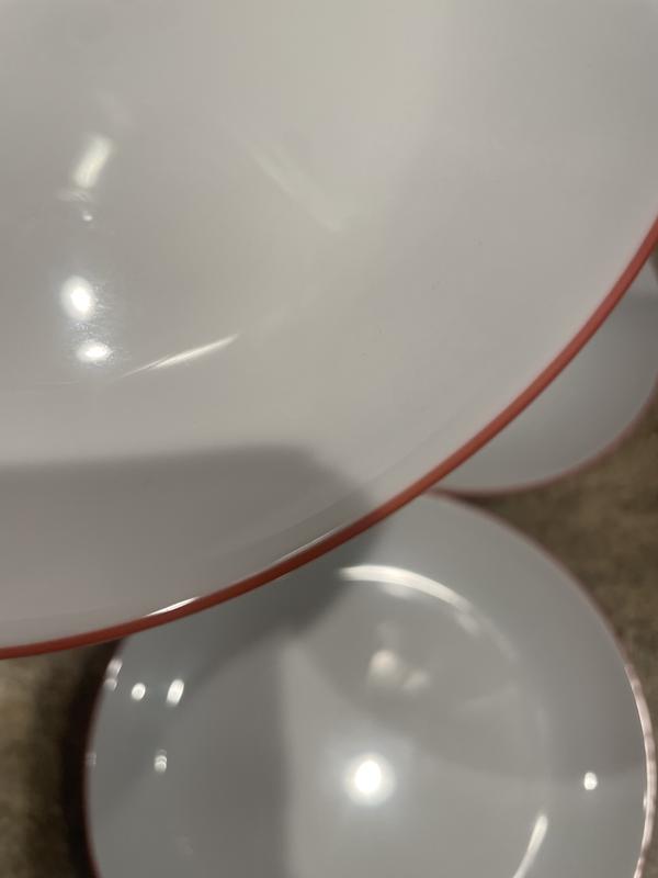 Perfect sized salad plates. Dishwasher/microwave safe. The red accent rim around the plate makes this white plate fancy looking. This plate is perfect for everyday use. You will not regret getting this set of four.