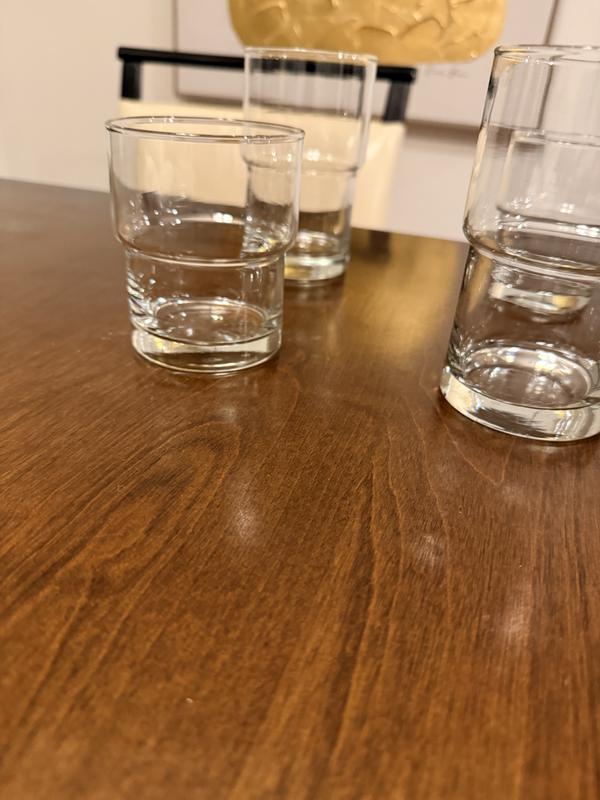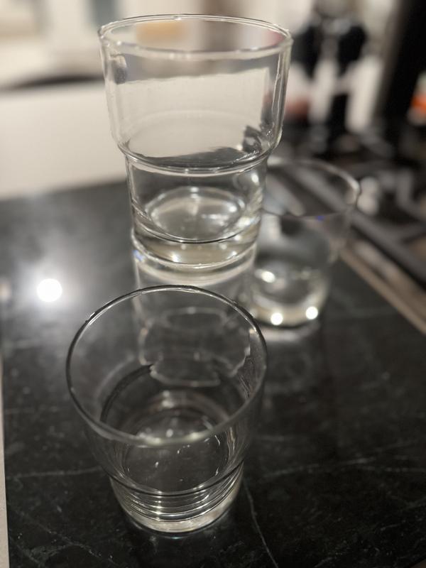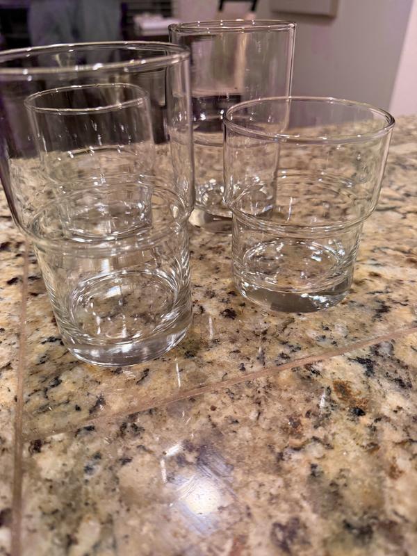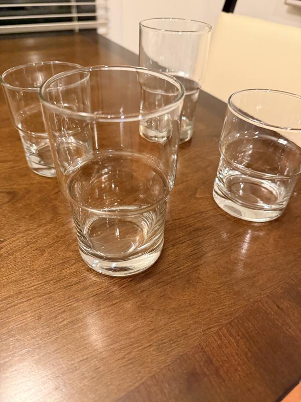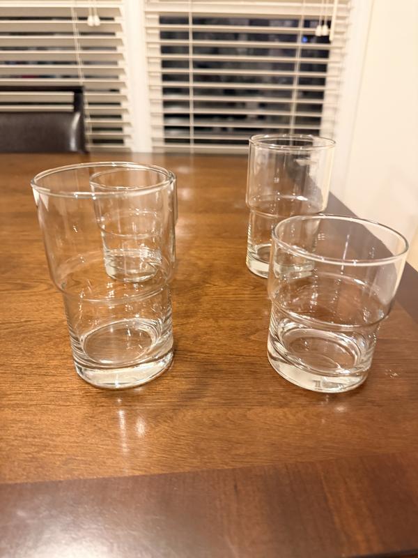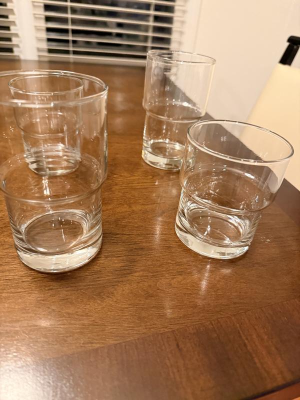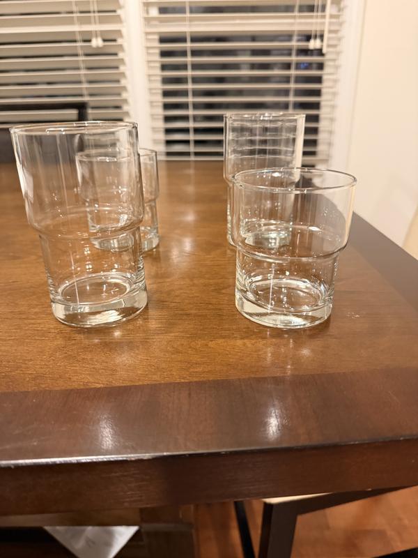 These may not be the prettiest of glasses, but they are very practical. The way they stack saves so much space. I do like that they are not too heavy and yet don't feel delicate. I would have liked them better with a little texture or design. I also like that you get 2 sizes in the set and you can stack any of them together. There is a bump in the rim of 6 out of 8 of the glasses. It doesn't bother me at all, but I am sure it won't sit right with some people.
