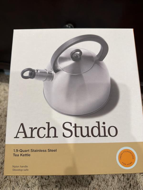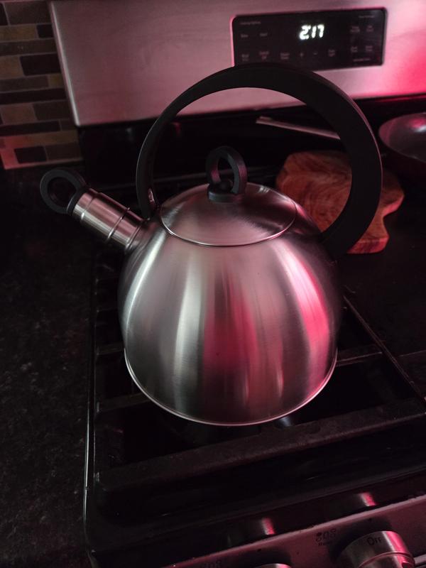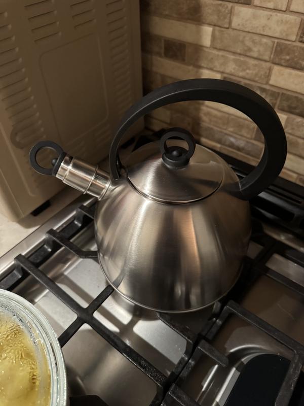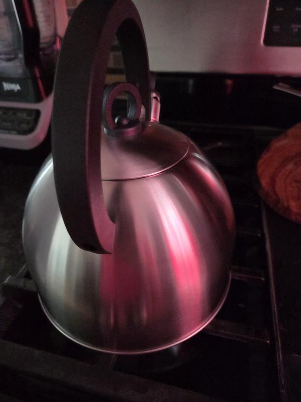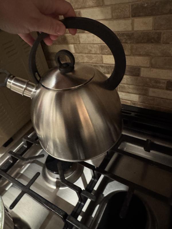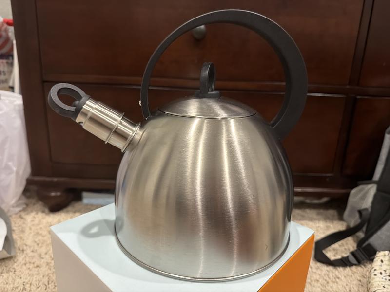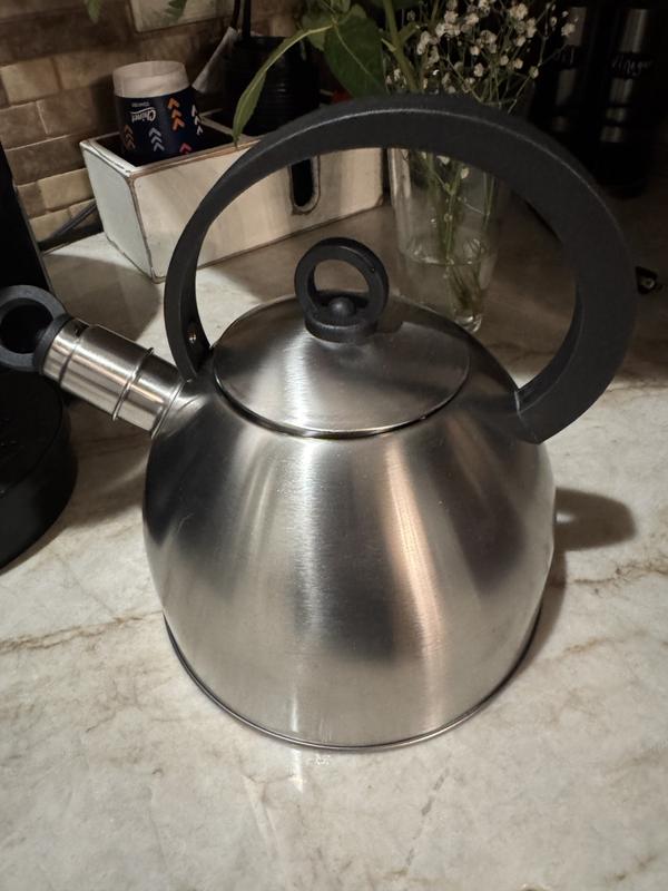Really nice tea kettle. A lot lighter and thinner material. Almost feels like tin. Nice stainless steel color that goes well with my kitchen. We do use this tea kettle daily, so I’m curious to see how long it lasts being that it is so thin compared to other kettles we’ve had. But it gets the job done!