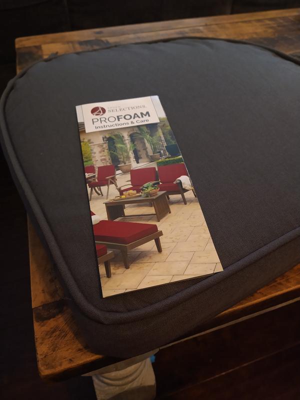 The ProFoam 18 x 18 in. Slate Grey Outdoor Rounded Square Outdoor Seat Cushion is a decent cushion, I would have liked it to be a little thicker, but that is my personal preference (I have a bony rear end). The cushion itself does not feel as plasticky as it looks. My FAVORITE feature is that the fabric cover is removeable and washable!!! I like the slate gray color, not too dark or too light.