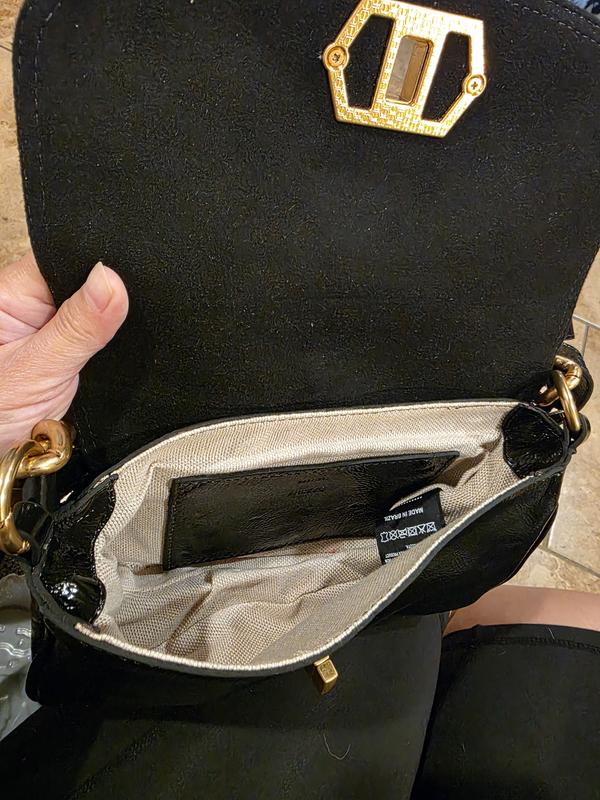 Arezzo crossbody handbag is a beautiful black leather purse with gold hardware. The leather feels soft, look amazing and smells good. The purse is shiny leather I think its more of a special occasion handbag like for wedding or party because its small and looks more elegant than casual. I think leather is so beautiful but you do have to be careful and avoid rough and sharp surfaces. The leather has small marks that add characteristic of 100 % leather bag. The only thing I dislike is that it doesn't have inside zipper to keep important stuff save from falling out it does have inner pocket just without a zipper. The crossbody strap and chain aren't removable. It would be great if they were removable because the chain makes purse a little heavy and you would be able to change between both different straps for different looks. Its a small bag but its big enough to fit cellphone, lipstick and mirror just basic items. Purse is 100% external leather and inner 85% cotton 15% leather. The inside on purse is a light tan color with a black leather pocket. In the picture it looks like purse has a pocket in th back but it doesn't have an external pocket. The purse weighs approximately 1 pound with chain and strap. Purse got here in a white dust bad. Which is great for storing handbag to prevent any damage. The turn lock is gold in color and feel sturdy and look really nice. Purse measurements are 9 inches width and 6 inches height. I used purse on Saturday for a friend's wedding I got a lot of compliments. The size was perfect just for essential items I needed for wedding.