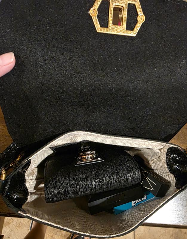 Gorgeous bag! Love that the material is smooth and shiny. Love that it has the strap for crossbody or over the shoulder holding and a bonus gold metal clutch strap. Both straps are removable. It’s got a good amount of room to fit phone, wallet, and more. It’s well made and has no marks after weeks of use. Great day to evening bag. Super happy about the bag and highly recommend it.