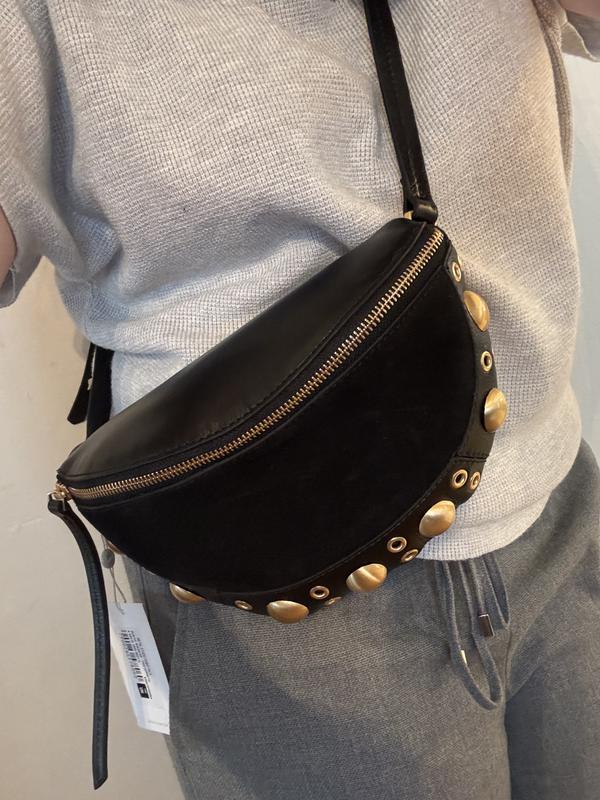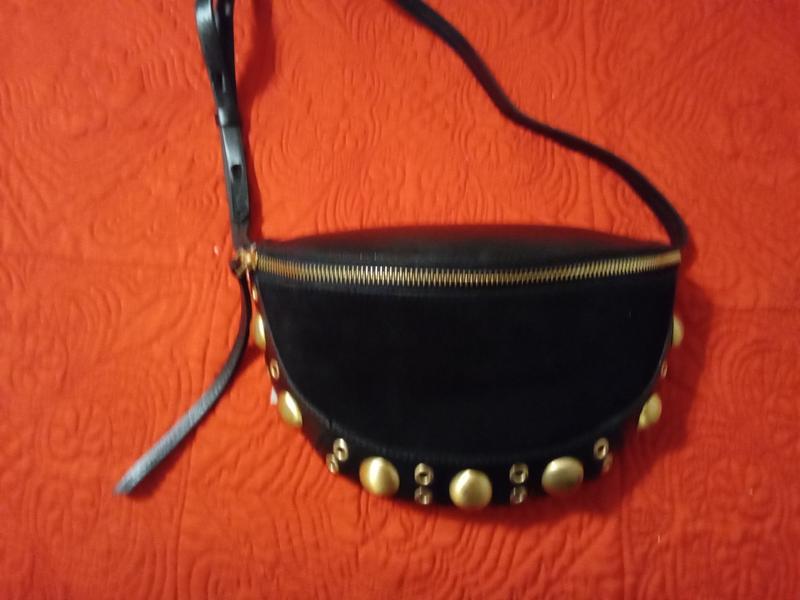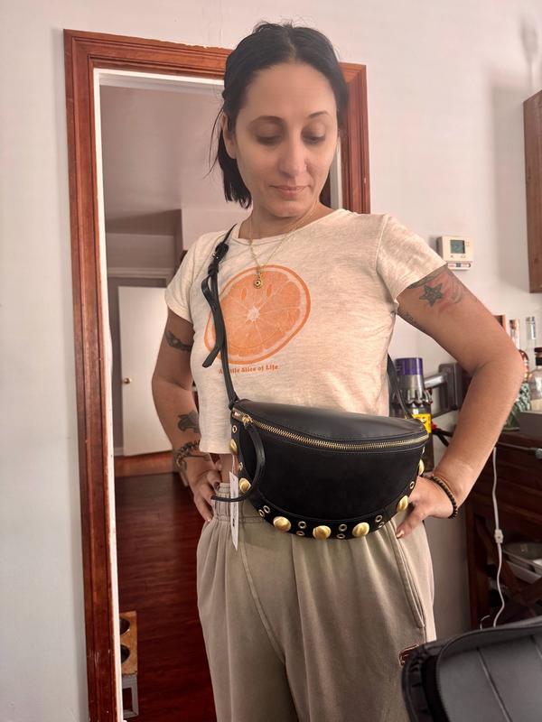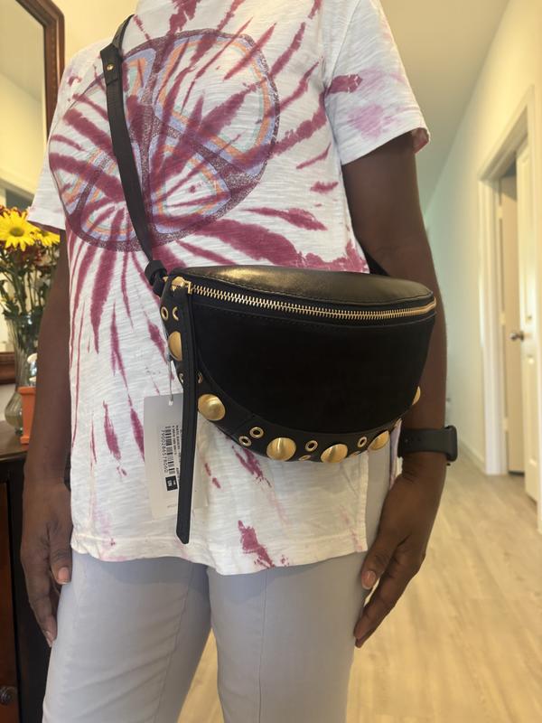This fanny pack is a nice size. It fits a small wallet, cellphone, keys and a few more items. I love the leather and suede combo and the gold studs gives it a unique look. I like wearing it as a crossbody but it can be worn around the waist or just throw it over the shoulder. Nice bag.