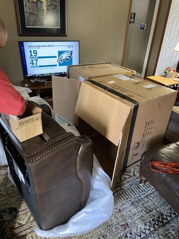 Wanted updated pair of recliners to replace Ethan Allen leather chairs we’d had for 20 years. Very happy with this pair purchased— the right brown color needed to blend in with rest of L. Room decor. Delivery date scheduled for within 1 week of purchase. Accurate delivery time as well. Each chair well wrapped in packing and cardboard box.”Some assembly required”. We did have to screw on the legs and also slide the back of recliner into the grooves-(easily done). Very pleased purchased pair. Also purchased while on sale.