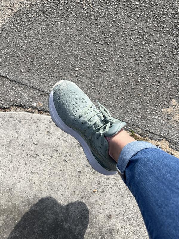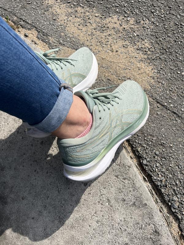 I purchased the sage green with golden logo shoes for my mom. The fit is comfortable, prevents her from going to hyper pronation. The shoes don’t look flashy. The only drawback is the lace feels shorter.