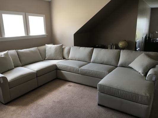 Love the grey color and the firmness sold us this couch, however the back seat cushions lose their shape quickly and the fabric pills. The fabric didn’t hold up but six months. I wish I had known I could have upgraded the fabric during the purchase. The rolling ottoman is a great addition to our L-shaped configuration however the large corner seat is angled and does not allow the Ottoman to go flush against the corner. I don’t think I’ll get the ten years out of this couch like my Lazy boy. I should have trusted the other reviews.