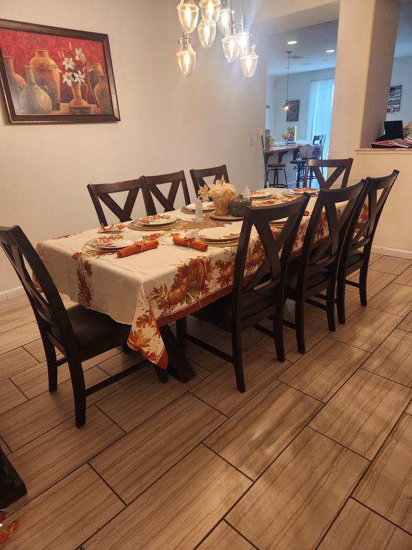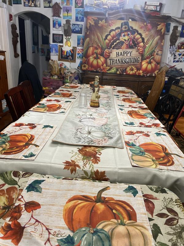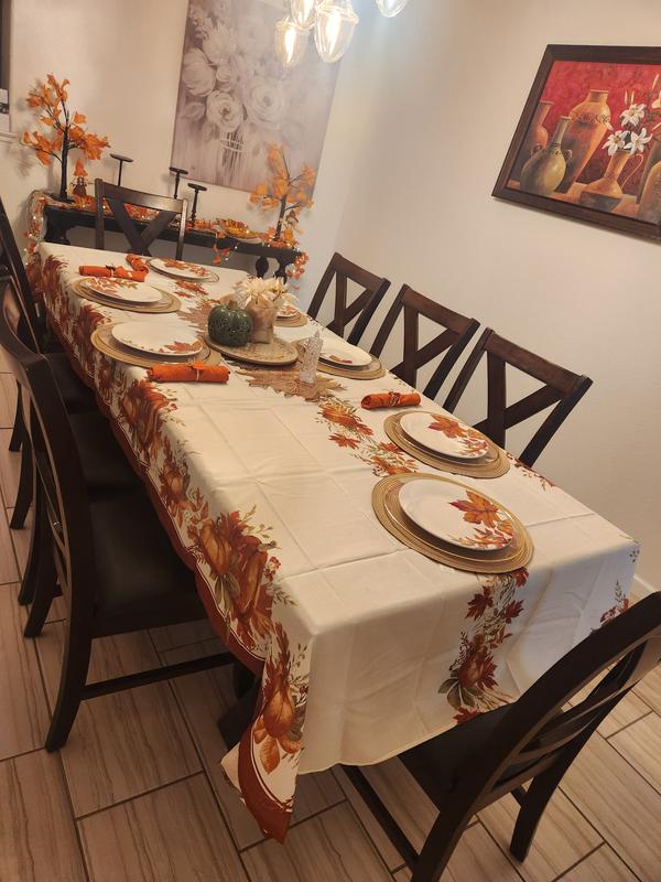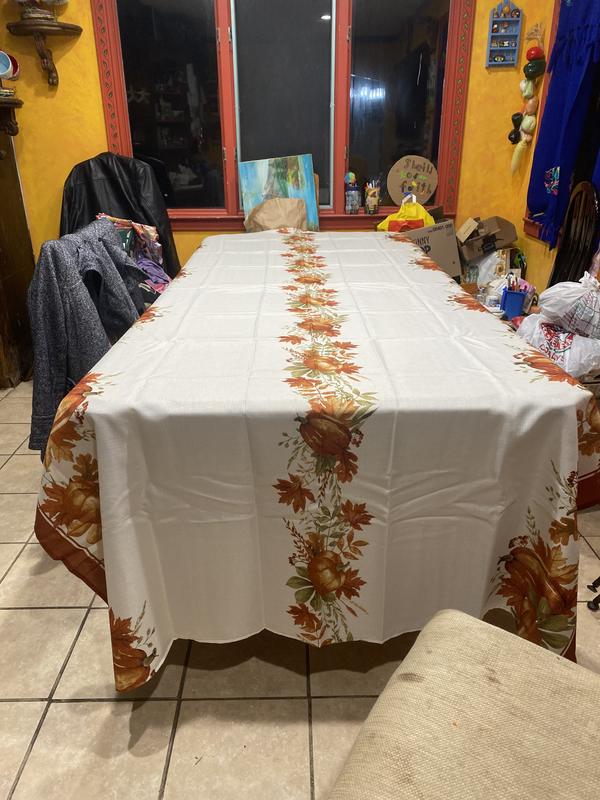 Pretty tablecloth. Added it, along with hardboard placemats with turkey design, to our beautiful table for Thanksgiving. Easy to clean. Doesn't need to be ironed.