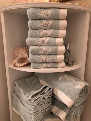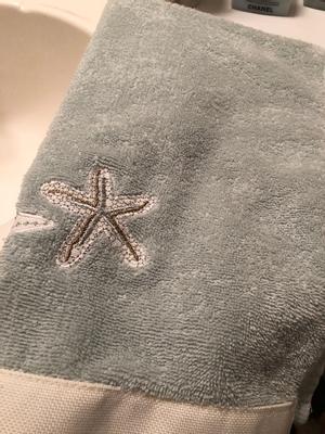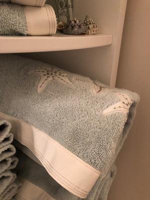 This is a nice decorative towel. It looks nice in my bathroom on the towel rack. I like the sparkle in the seaside design.