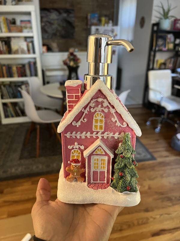 The Avanti Sparkle House Decorative Lotion/ Soap/ Sanitizer Dispenser is a pink figural house with yellow windows, white accents, a Christmas tree and gingerbread man. Made of durable, hand-painted resin with glitter to add a lot of sparkle. Finished with a shiny silver pump.