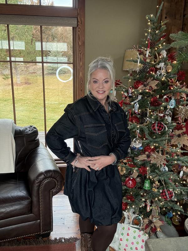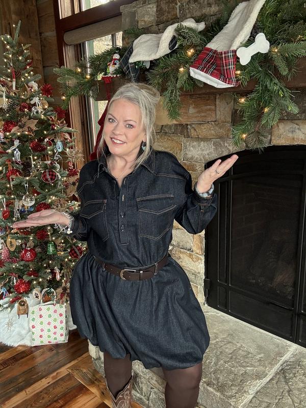 Ok… honest truth. I saw this dress in a Macy’s but they dint have my size. I went online to order and almost didn’t because of the reviews. I am between a size 8-10 and I ordered a 12. It fit perfectly!! Not only is the balloon hem on style but the fit is spot on. Yes it is a bit restrictive thru the shoulder sand arms but getting a size up relieves that. It has pockets, has semi-thick denim and just gives “it” vibes. I pairs this with brown tights, my Ariat boots and my Stetson hat. Heck YES!