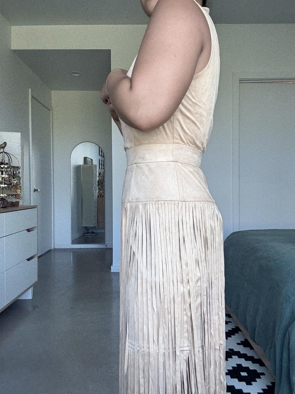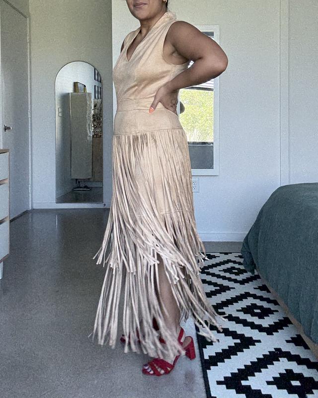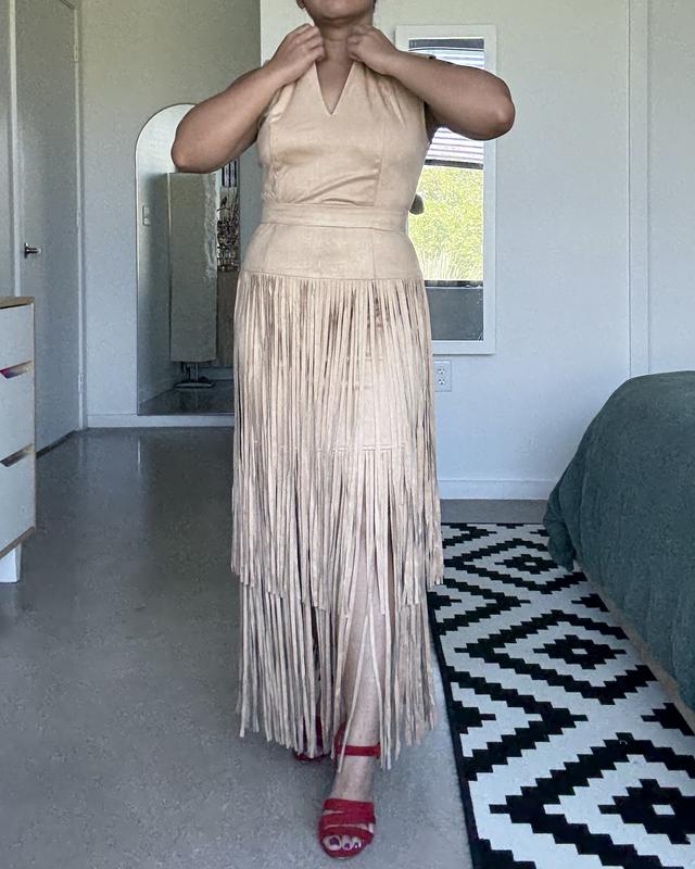 The material is substantial and super high quality. Will make for a great transition-to-fall dress (and you can layer it with a turtleneck underneath once it gets too cold). Oh and the biggest bonus point is the fringe moves GORGEOUSLY