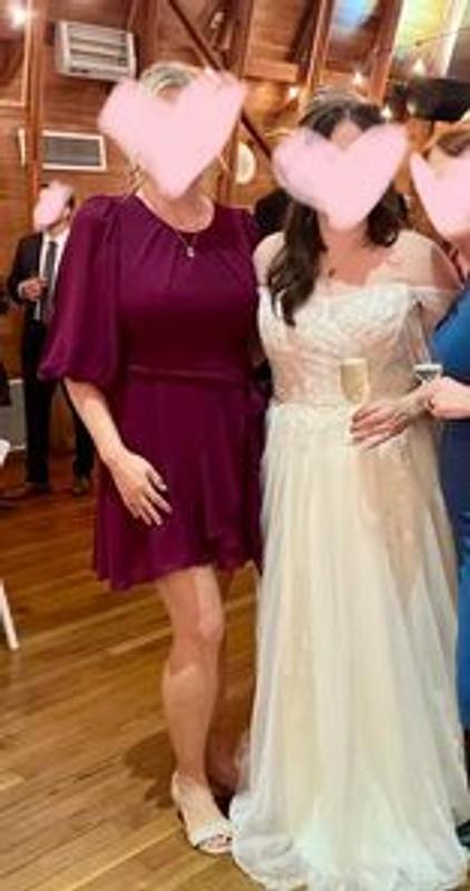 A photo of this dress just not reveal how lovely it truly is! The subtle ruffles do not appear on the photo but in person they are so soft and gently flowing on the dress. The burgundy color is perfect for this style! The neckline is pleated and looks elegant. This dress made.my teenage girl feel "like a princess."
