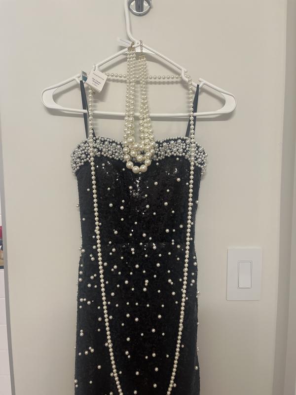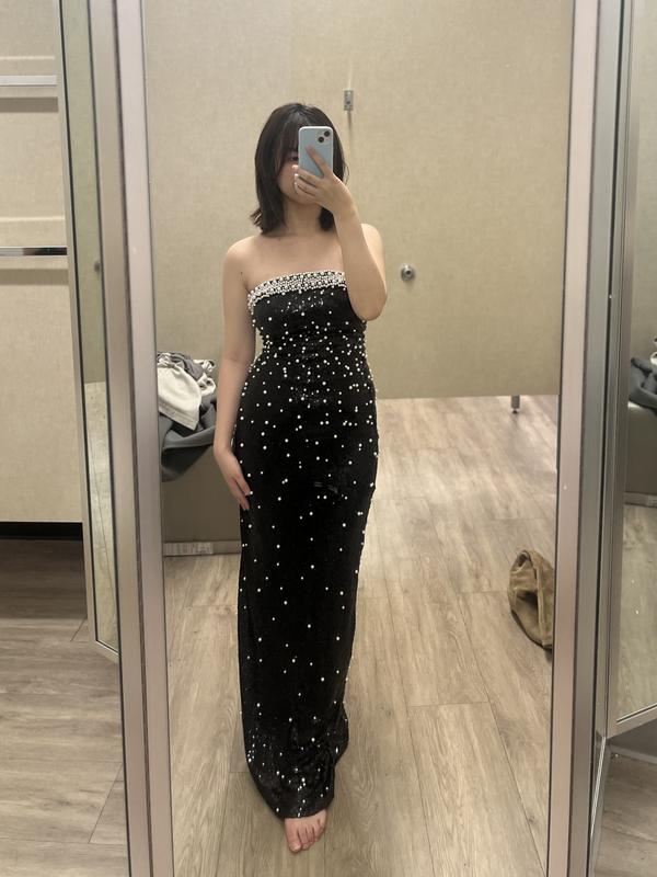 This dress is a total showstopper! The black sequins and white pearls make it so elegant and eye-catching—I got so many compliments all night. I’m 5’4” and had to have it hemmed, but the fit was worth it. I have a larger chest and was amazed that the strapless design actually supported me without a bra! I felt sexy but still classy, not over the top. It hugged all the right places and made me feel confident and gorgeous. The quality exceeded my expectations, and I just saw it’s $34 cheaper than when I bought it a few weeks ago—such a steal! Highly recommend if you want something glam that turns heads.
