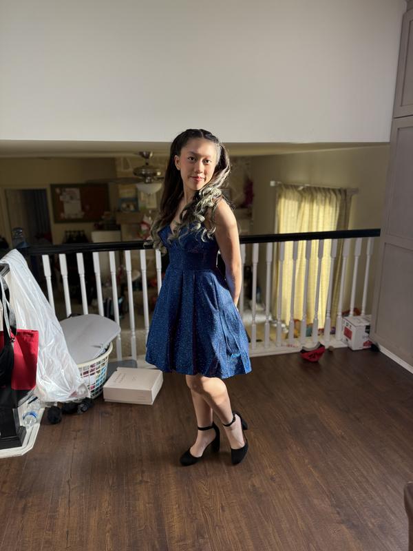 My daughter picked this dress for homecoming. Nice fit and very pretty color. Only downside she had blue glitter everywhere and anyone she came in contact with was covered too.