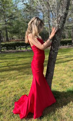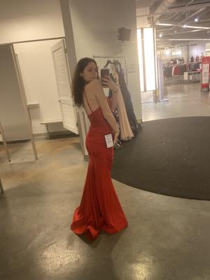 This is a beautiful gown. Purchased as a gift for formal dance. She is 5’2, 118 lbs. Size XS fit perfectly. The red is vibrant and the fabric finish is very pretty with not too much shine. This gives the gown a glamorous look. Fabric is soft to the touch. Beautiful dress at a great price!