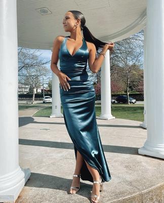 okay so the material is like not super stretchy but it moves enough to pull out over the hips. so flattering in person. the color is absolutely gorgeous. definitely recommend to my curvy girls. for ex I’m 5’6 and 170. and it fits me pretty good. it is snug in the hips but it covers the belly and the straps in the back are kinda like a corse type thing. so you can pull it tighter in the waist and bust area. only problem is that the ties at the back of the neck are not adjustable so for my smaller chest girls it is a little loose but it’s nothing a pin can’t fix and even without one it’s not too bad.without heels it does sit on the floor but with even a two inch heel it would be the perfect length.