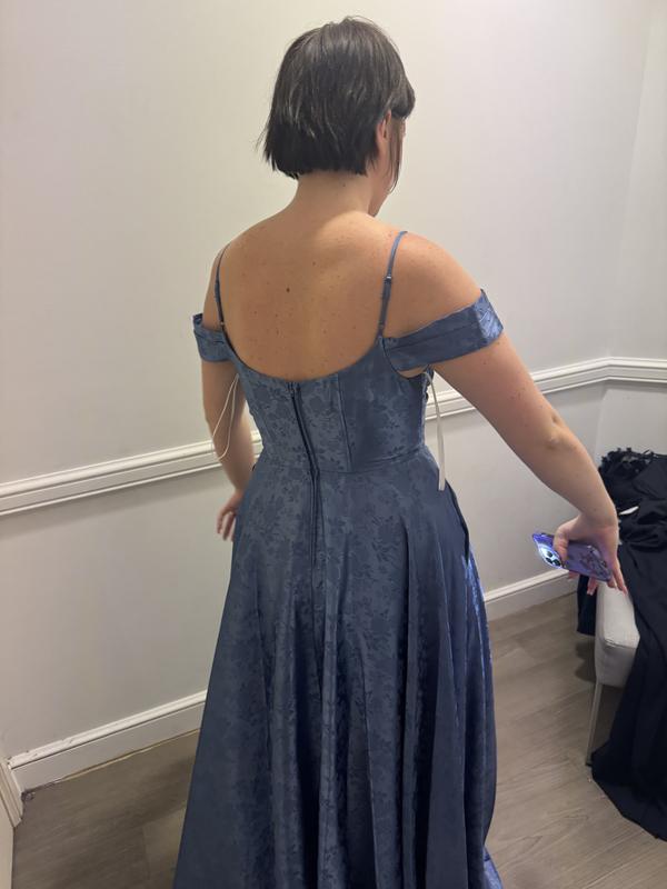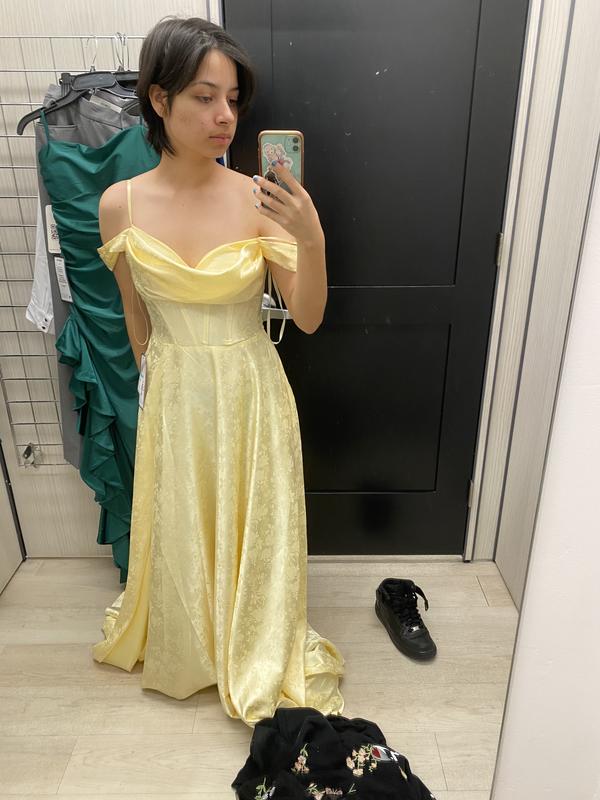Loved the yellow color and satin with subtle print. Corset and pockets definitely sold the dress. On the size 7/8 dress, bust not made for C-cup or bigger without feeling too exposed.