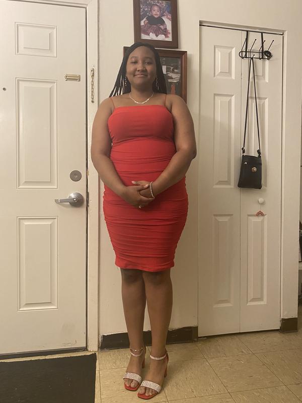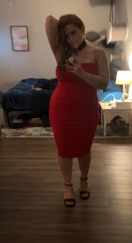 I got this dress in black, and it looks amazing! I sized up slightly to ensure a comfortable fit—not too tight or restrictive—and it worked out perfectly. The fabric drapes beautifully, and I felt confident and comfortable wearing it. No awkward bulging, just a sleek and flattering look. Definitely a great find.